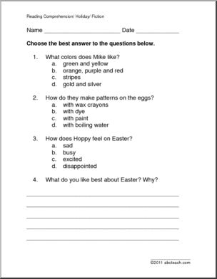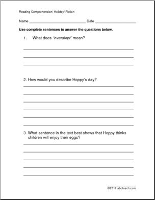 A 1 page selection about the Easter Bunny’s busy day before Easter is followed by 3 multiple choice questions and four questions that require a brief written response.
