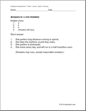 A 1 page realistic fiction piece,”I Love Running” is followed by 3 multiple choice questions and 5 questions requiring short written responses.