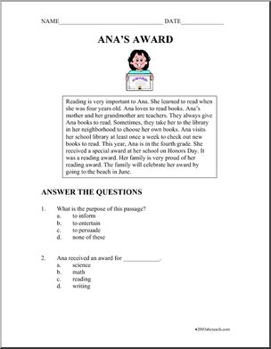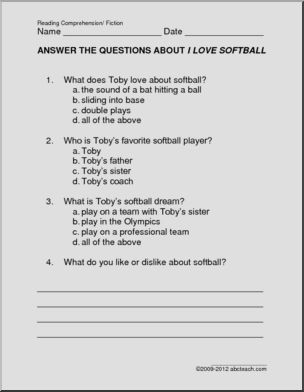 “I love the crack of a bat hitting a ball.” Realistic fiction followed by multiple choice questions.