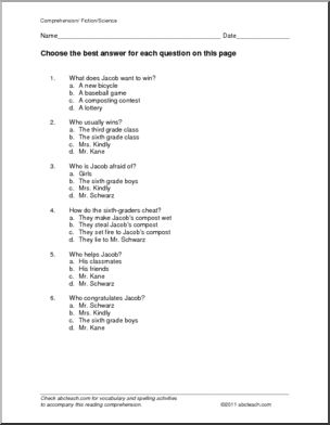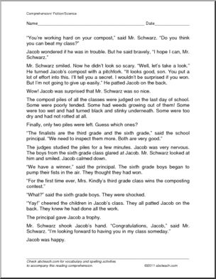 Jacob takes on the best composting class in the school. Can this third grader beat the sixth graders? A two page short story with multiple choice and short answer questions.