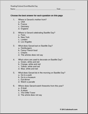 Gerard and his sister, Maria, celebrate Bastille Day in Paris. Story is followed by multiple choice and short answer question sets.