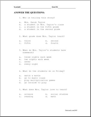 “Mrs. Taylor is my favorite teacher.” A realistic fiction reading comprehension about a third grade teacher.