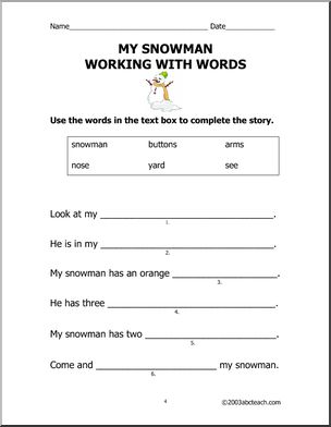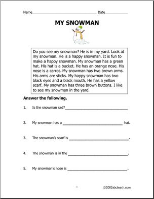 “Do you see my snowman?” A happy snowman is featured in a winter-themed mini-unit, with a reading comprehension, word scramble, and more.