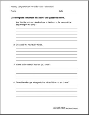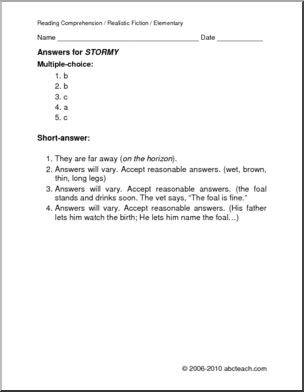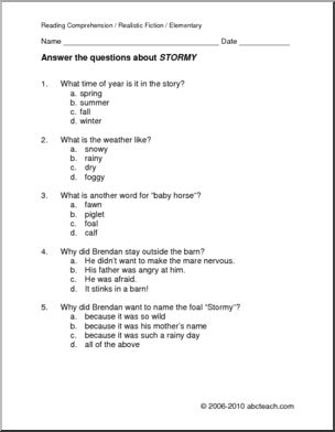 A 1 page selection of realistic fiction “Stormy” is about a foal born during a rainstorm. It is followed by 5 multiple choice questions and 4 questions requiring short written responses.