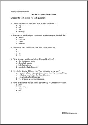 Fictional story about Chinese New Year, followed by multiple choice comprehension, short answer, and essay questions.
