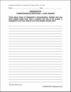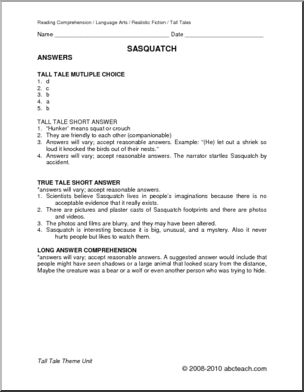 Read a realistic fiction Sasquatch story and answer the 5 multiple choice and 4 brief written response questions. Then read a non-fiction selection and answer the 4 short answer comprehension questions. Think and Write about the values reflected in these tales in a longer essay. Finally: Write your own Sasquatch tall tale and illustrate it.