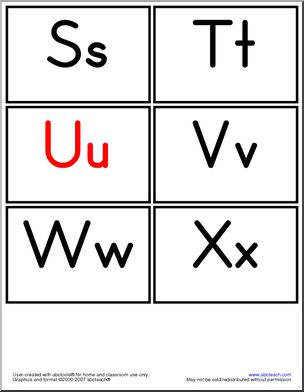 [member-created using abctools] The letters of the alphabet on flashcards (six cards to a page); vowels in red.