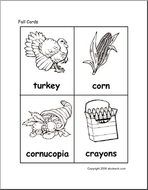 Twenty flashcards (four to a page) with a fall theme. Acorns and pumpkins, jackets and rakes, Veteran’s Day and Thanksgiving,etc. These make “call out” cards for our fall bingo set.