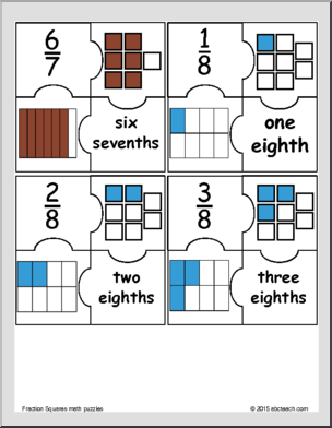 This Fraction Squares Math Puzzle is perfect to practice fraction skills. Your elementary grade students will love this Fraction Squares Math Puzzle. Match the fraction forms – number, word, parts of a whole, parts of a group – to solve the puzzle. Includes denominators from 2 to 8. Laminate for a fun, reuseable classroom game.