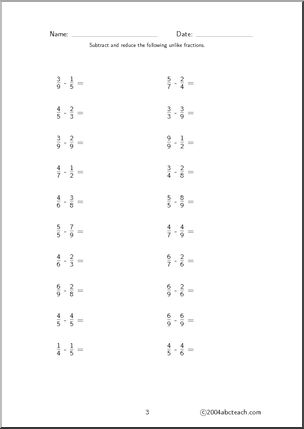 This Fraction Subtraction – unlike (set 2) Worksheet is perfect to practice fraction subtraction skills. Your elementary grade students will love this Fraction Subtraction – unlike (set 2) Worksheet. Printable fraction and subtraction worksheets, using single digits, unlike fractions; 5 pages long.