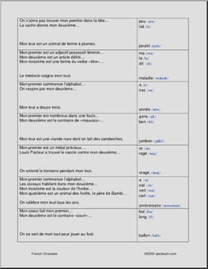 42 classic French charades. Teacher can read clues to class, or cut and distribute individually to students to come forward and present clues. 42 charades en franÃais. Le professeur peut lire les indices, ou les distribuer aux ÈlËves pour des prÈsentations individuelles.