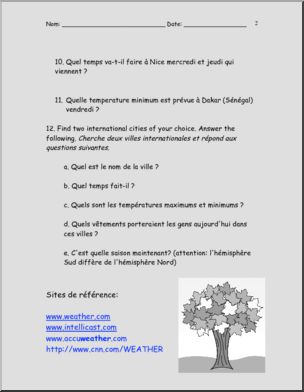 ActivitÈ sur internet pour renforcer les expressions de la mÈtÈo. Chercher la prÈvision mÈtÈo (le bulletin mÈtÈorologique) pour des villes diverses du monde francophone. Internet activity to practice weather related expressions. Look up forecasts for various cities in the French-speaking world.