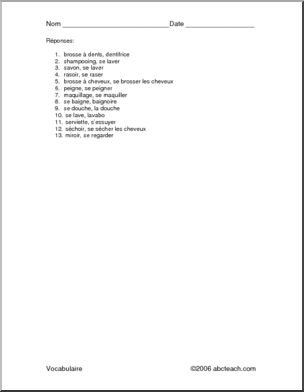 Vocabulary exercise for grooming, nouns and reflexive verbs. Exercice de vocabulaire, soins de toilette, noms et verbes rÈflÈchis.