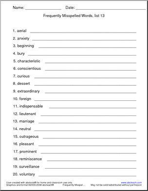 Use this ‘Spelling List: Frequently Misspelled Words (list 13)’ printable worksheet in the classroom or at home. Your students will love this ‘Spelling List: Frequently Misspelled Words (list 13)’. [made with abctools] A list of 20 frequently misspelled words, from AERIAL to VOLUNTARY, to use as a spelling lesson.