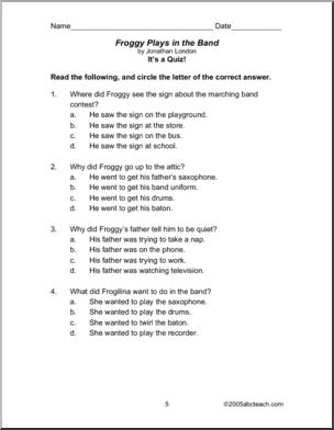 Use this ‘Book: Froggy Plays in the Band (primary)’ printable worksheet in the classroom or at home. Your students will love this ‘Book: Froggy Plays in the Band (primary)’. Book unit and vocabulary lesson corresponding with this book about a young frog in a band.