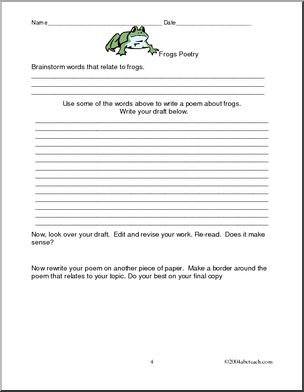 Use this ‘Writing Prompt: Frogs (elementary)’ printable worksheet in the classroom or at home. Your students will love this ‘Writing Prompt: Frogs (elementary)’. Alliteration, simile,acrostic and poetry forms: six pages of writing and poetry activities with a frog theme.