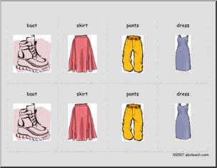 Play as “Go Fish” or “Concentration” game to practice clothing vocabulary. Elementary.