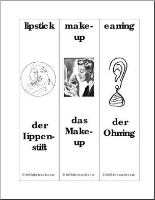 Fourteen bookmarks with German accessory-related vocabulary words, the English translations and b/w illustrations.