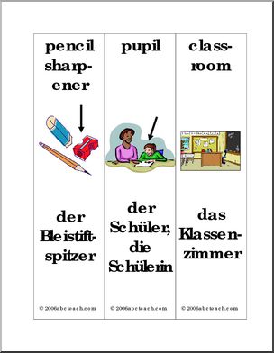 Bookmarks for 18 common classroom items, with color illustrations and the word in English and German.