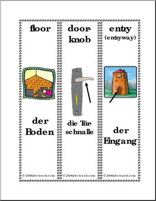 Bookmarks with English on top, German on the bottom, and a representative picture (a house, a roof, a door) in the middle.