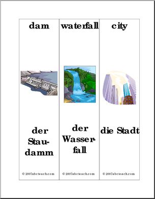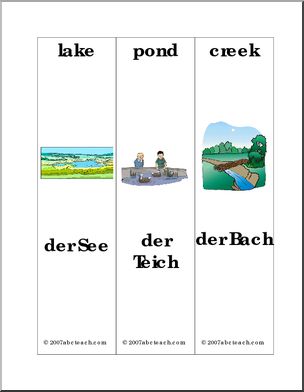 Bookmarks with color illustrations of landscape vocabulary; English word above and German word below.