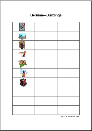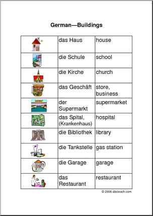 Seventeen basic buildings presented on a color chart. Useful for study or as a bulletin board decoration. In German and in German/English, as well as unlabeled to use as a worksheet etc.