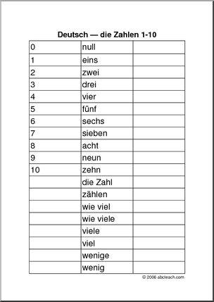 This simple chart shows the words for numbers 0-10, plus common vocabulary (how much, how many, etc.) in English and German.