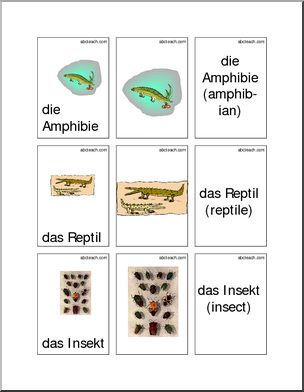 Picture cards with vocabulary words in German, with no text, and flashcards with the words in German and English.