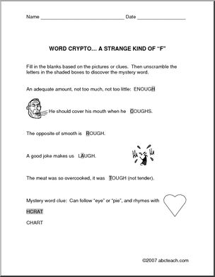 Use this ‘Word Crypto: -GH words (elem/upper elem)’ printable worksheet in the classroom or at home. Your students will love this ‘Word Crypto: -GH words (elem/upper elem)’. Fill in the missing letters for the various GH words; then use the letters to decode the secret message! Vocabulary fun.