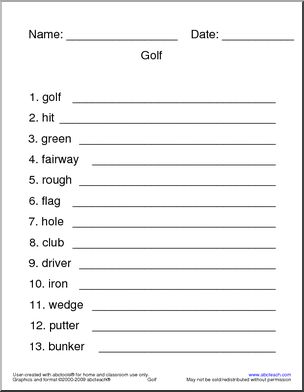 Use this ‘Spelling List: Golf Terminology’ printable worksheet in the classroom or at home. Your students will love this ‘Spelling List: Golf Terminology’. 23 words from BALL MARKER to WEDGE
