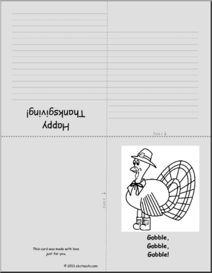 A set of two black and while, foldable Thanksgiving greeting cards. Each has line illustrations to color and blank primary printing lines to add a message.