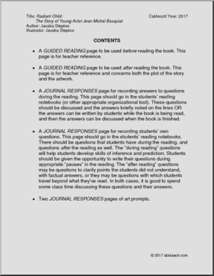 Suggestions for teachers to guide students during a “read aloud” of Javaka Steptoe’s 2017 Caldecott winner, with pages for students to fill in their own before, during, and after reading questions; this unit includes art prompts.