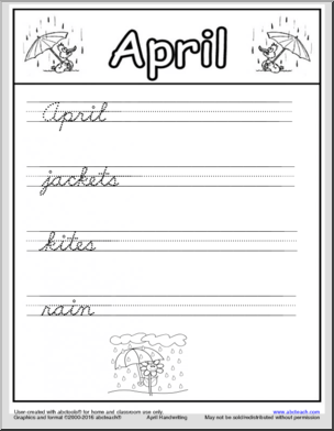 Fun, cursive handwriting practice in dn-style font. Five pages of April-themed handwriting pages. Writing prompts, and coloring pages! Great activity for spring.