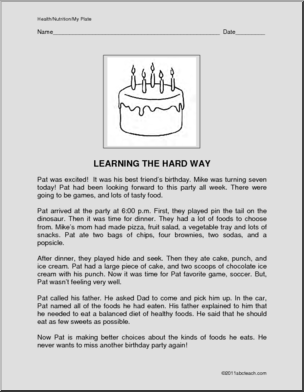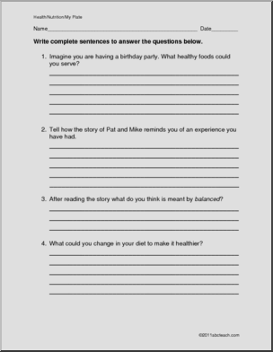 A 9 page unit on nutrition and healthy food groups, featuring the USDA 2011 food guide, MyPlate. Unit includes facts and short fiction, graphs, multiple choice, short answer questions, writing prompt and an apple shaped word search.