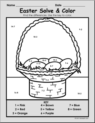 Six pages of Easter illustrations with math facts to solve and color by number. Two pages each of addition facts and subtraction facts. One page each of double facts and double plus one facts. All numbers are under 20.