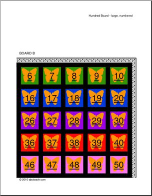 Color butterfly shapes on board numbered to one-hundred to use with hundred butterfly tiles.
