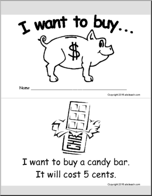 This I Want to Buy… (b/w)(primary) Early Reader is perfect to practice money skills. Your elementary grade students will love this I Want to Buy… (b/w)(primary) Early Reader. An eight page booklet illustrating the number of coins needed to buy certain items; such as candy or toys. Helps students understand the value of each coin.