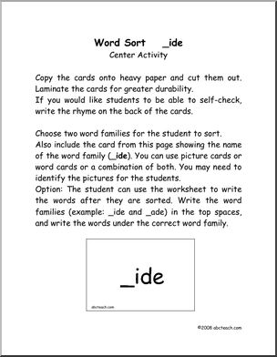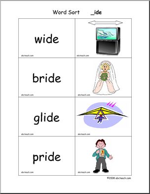 Use this ‘Word Sort Center: -ide Words’ printable worksheet in the classroom or at home. Your students will love this ‘Word Sort Center: -ide Words’. Cards with words and matching pictures for words ending in -ide; these can be used in matching games and word sort center activities.