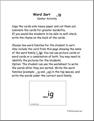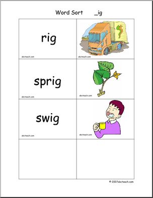 Use this ‘Word Sort Center: -ig Words’ printable worksheet in the classroom or at home. Your students will love this ‘Word Sort Center: -ig Words’. Cards with words and matching pictures for words ending in -ig, these can be used in matching games and word sort center activities.