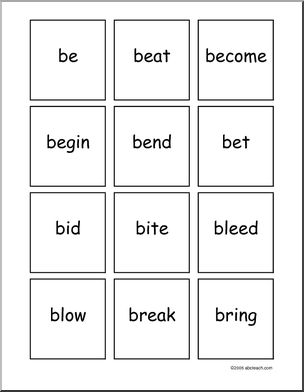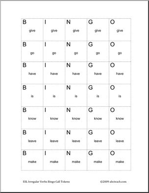 Instructions, call sheet, and call tokens for irregular verb bingo game.
