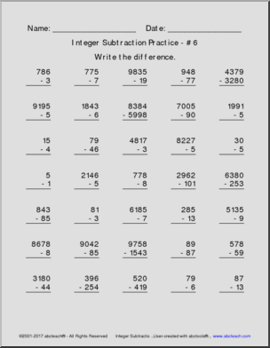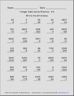 Integer Subtraction Practice Pack (all positive integers)