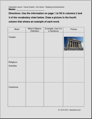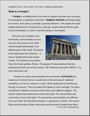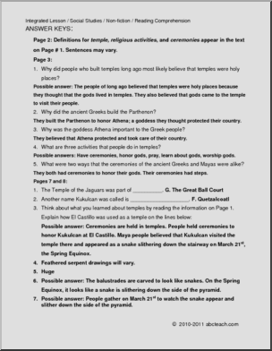 Reading Comprehension: El Castillo, the Mayan Temple of Kukulcan in the Great Plaza of Chichen Itza in Mexico with comparisons to the Parthenon. Nine pages with color photos. Three pages of questions/activities and a one page answer key.