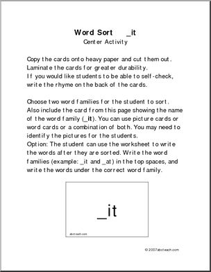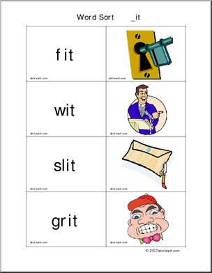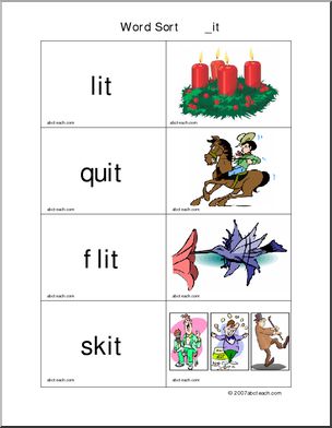 Use this ‘Word Sort Center: -it Words’ printable worksheet in the classroom or at home. Your students will love this ‘Word Sort Center: -it Words’. Cards with words and matching pictures for words ending in -it; these can be used in matching games and word sort center activities.