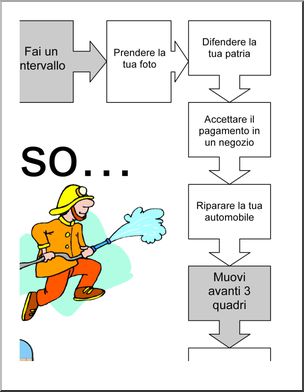 Cartello di dimensioni alternative per il gioco, “IO POSSO…SPEGNERE IL FUOCO! CHI SONO IO?” Alternative, large-sized board for an Italian vocabulary game of professions: “I CAN…PUT OUT A FIRE. WHO AM I?”