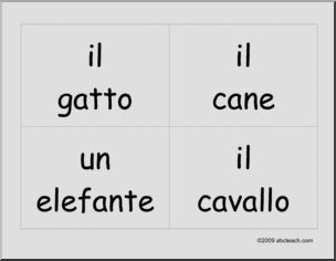 Piccole schede per praticare il vocabulario degli animali– cane, cavallo, gatto, elefante. A colori. Small flashcards to practice animal vocabulary–dog, horse, cat, elephant. Color.
