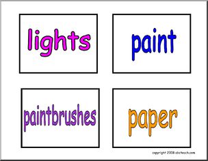 Number Fish, Screws & Bolts, Bones, Letter Molds, Large Pattern Blocks, Snap-Fit Blocks. Six to a page. Useful for labeling book cubbies/baskets.