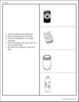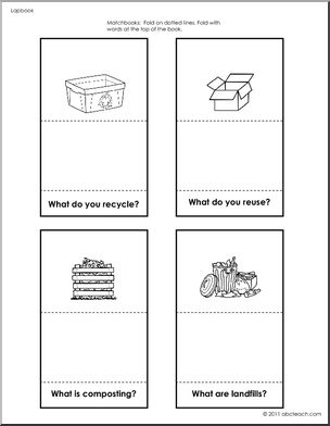 An eight page set of templates to create a lap book on the topic of recycling, includes templates for pockets, flashcards, flipbooks, match books, book cover.