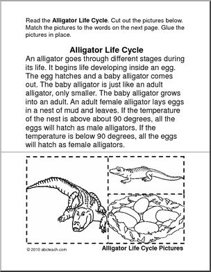 Life cycle of an alligator color illustrated with reading text, b/w drawings to cut and paste in order, color.