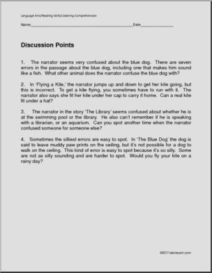 Use this ‘Comprehension: Listening; Absurdities (primary)’ printable worksheet in the classroom or at home. Your students will love this ‘Comprehension: Listening; Absurdities (primary)’. Three short stories with absurd errors in each sentence. Student listens and identifies each error. A page of discussion points is included.