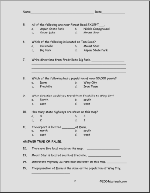 Students read realistic road maps and answer directions. Good practice with map skills such as reading legends and with directions.